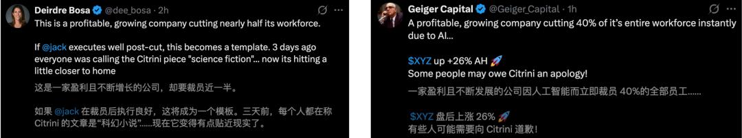 过去一年里,Salesforce、CrowdStrike 等大厂也曾因AI裁减数千名白领,但Block高达40%的裁员比例,显然更加激进。