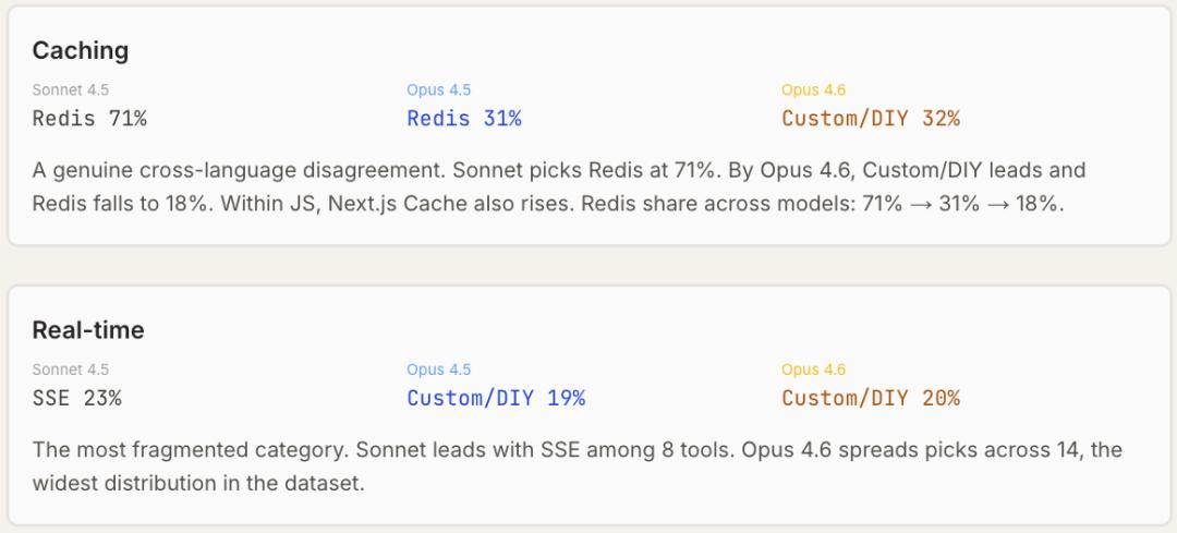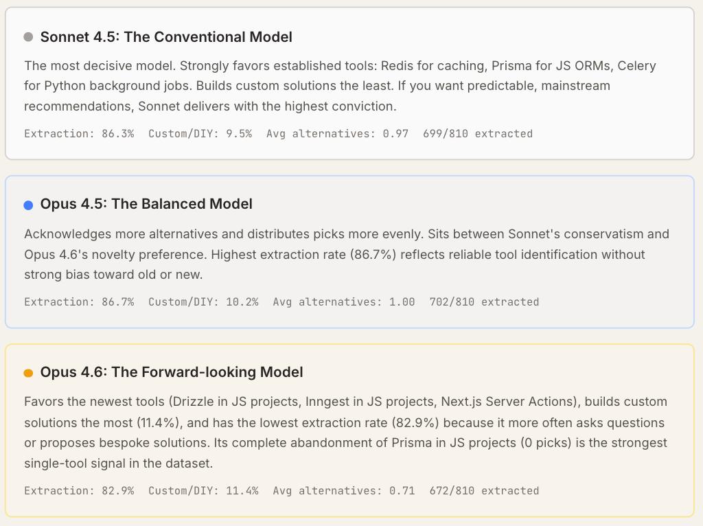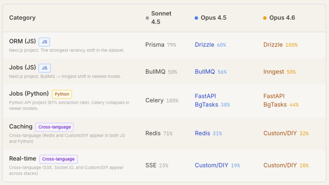 Opus 4.6更倾向推荐新工具与自定义方案,而4.5代模型更偏好成熟稳定的工具。