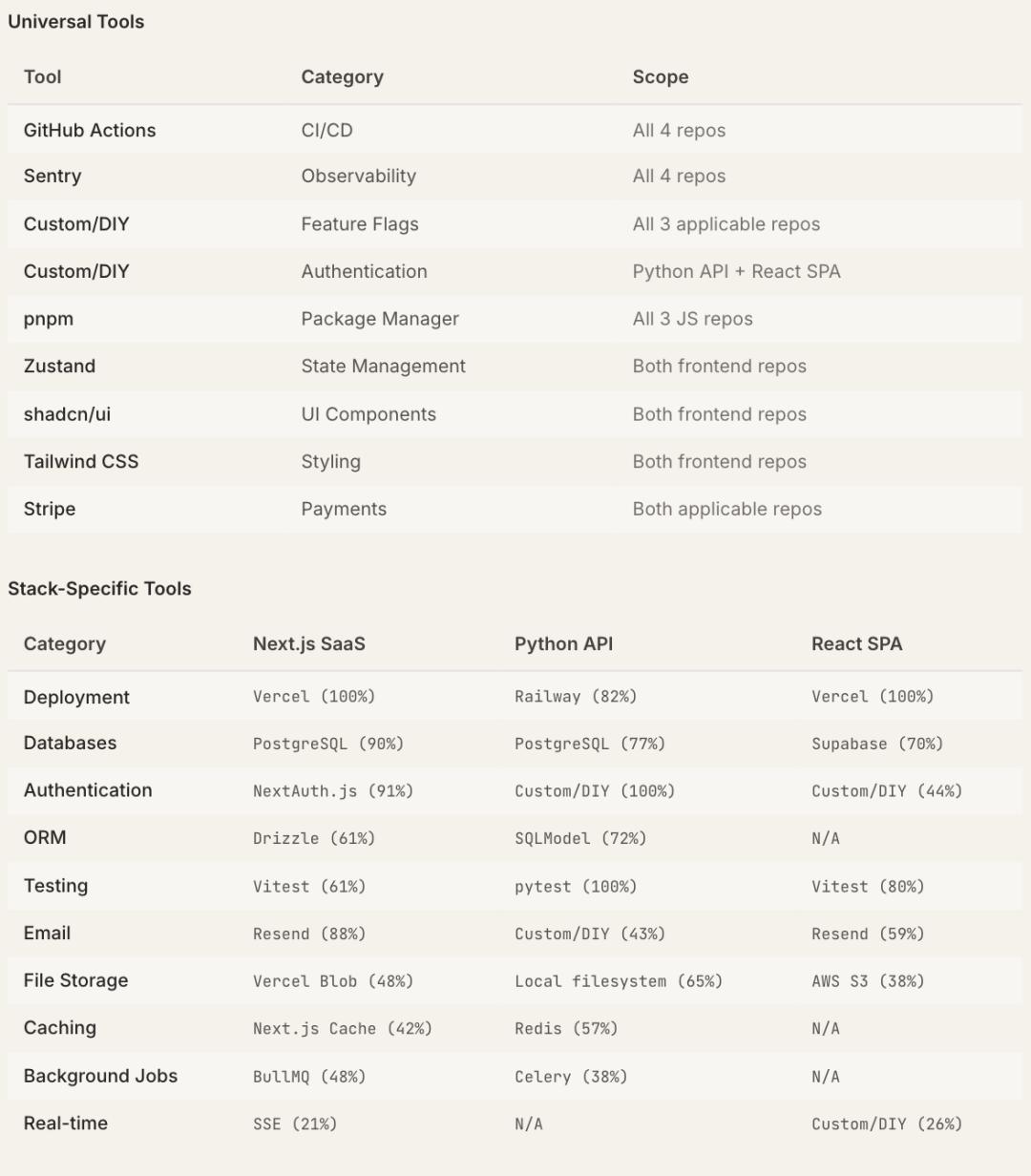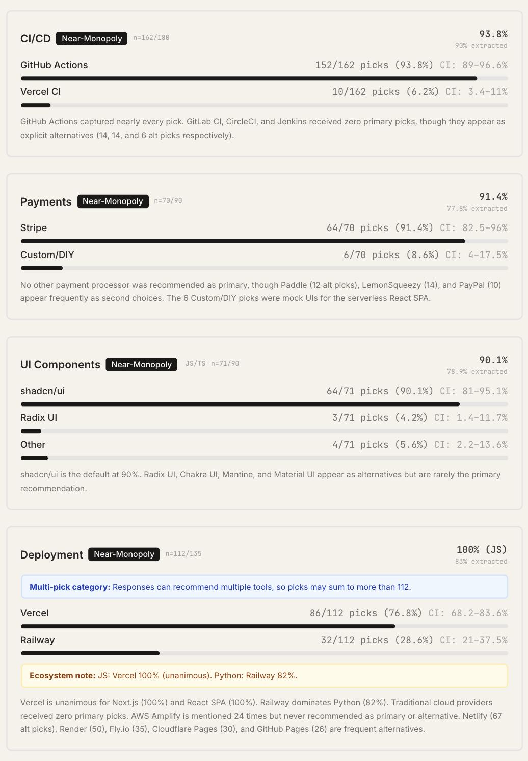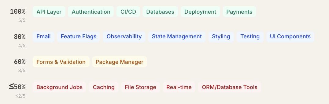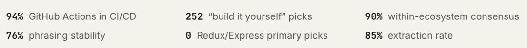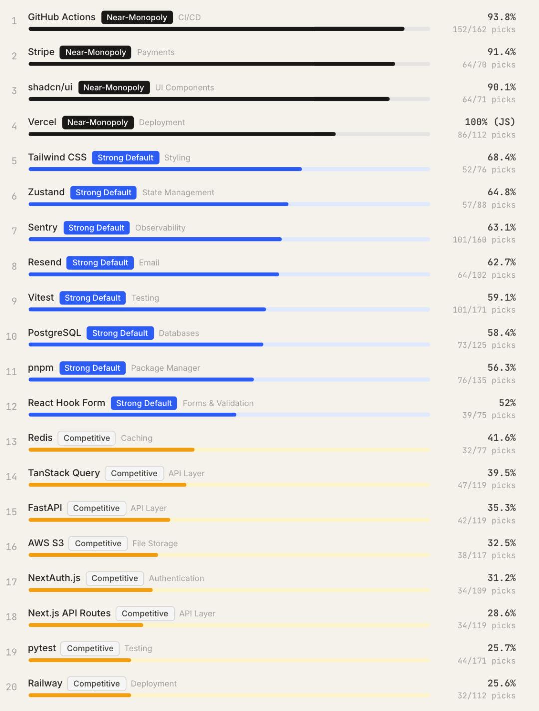 GitHub Actions占据CI/CD类别94%的选择,shadcn/ui占据UI组件类别90%的选择,Stripe占据了支付类别91%的选择。