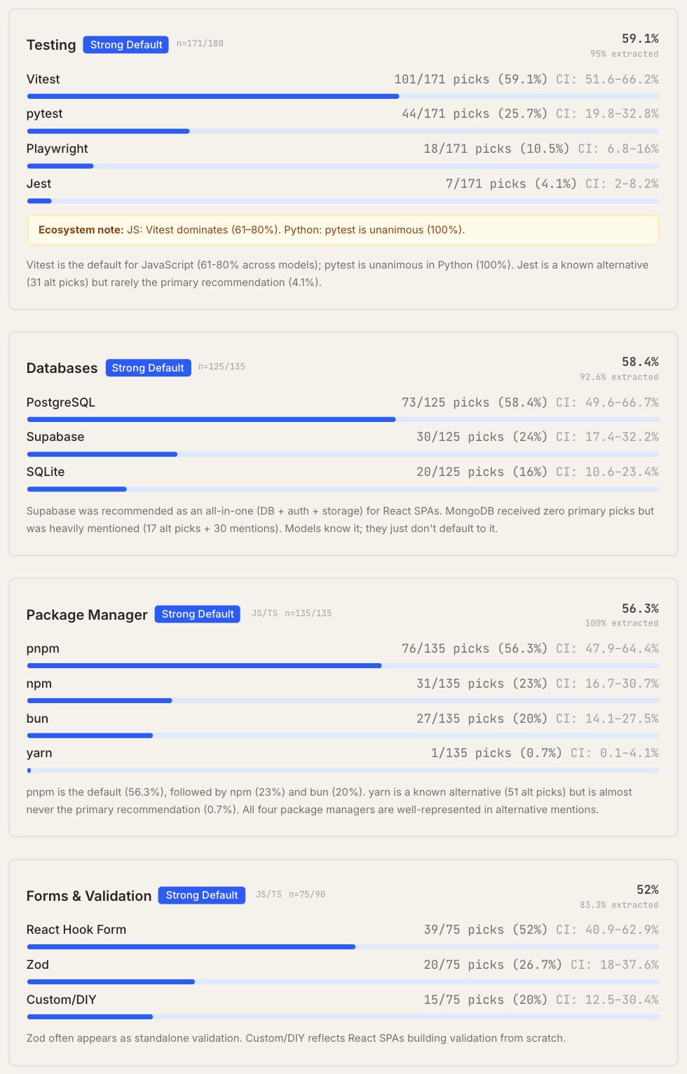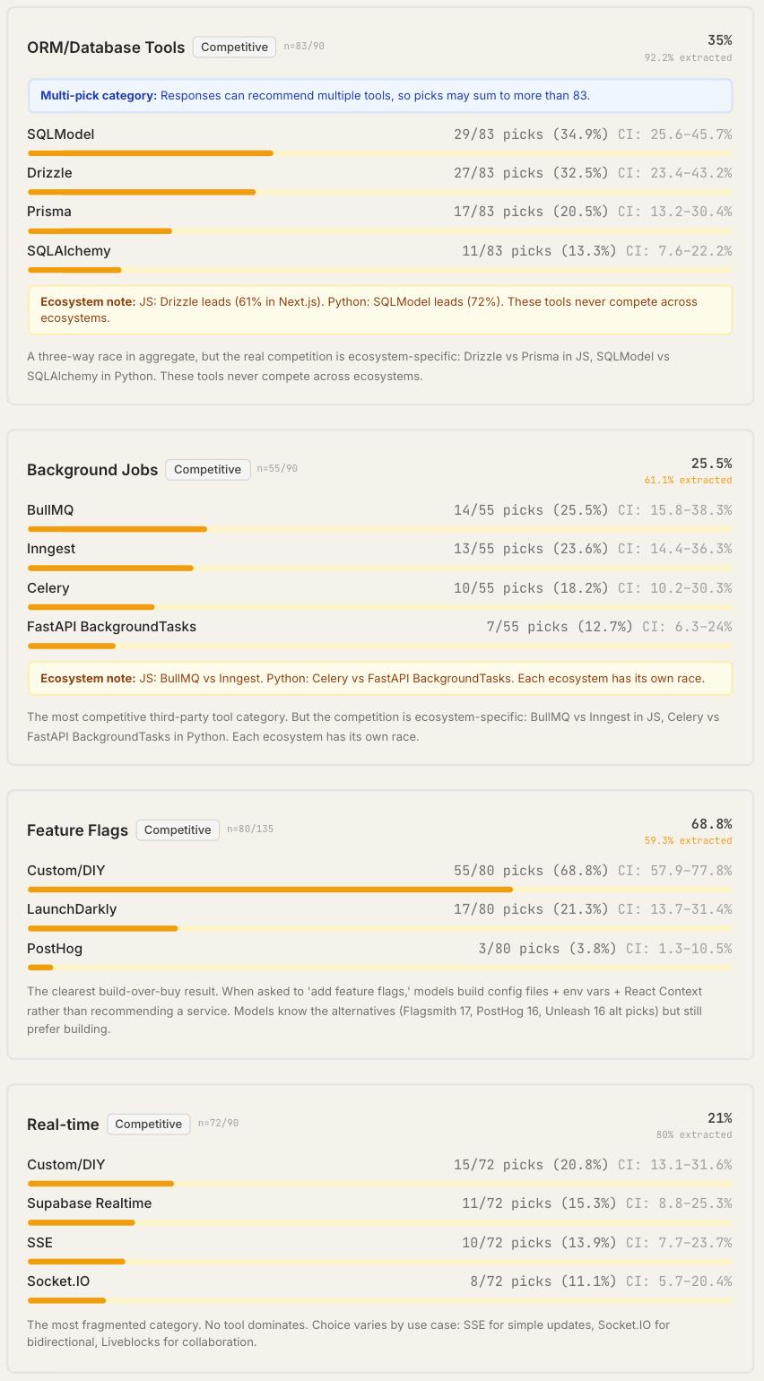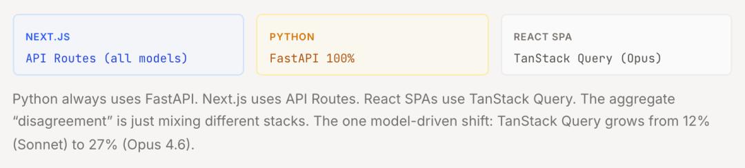 团队细分4个测试仓库的每个工具类别,对比三款模型的选择差异发现:同一模型在Next.js项目中会推荐Drizzle作为ORM工具,而在Python项目中则会选择SQLModel(具体细节可查看完整研究报告)。