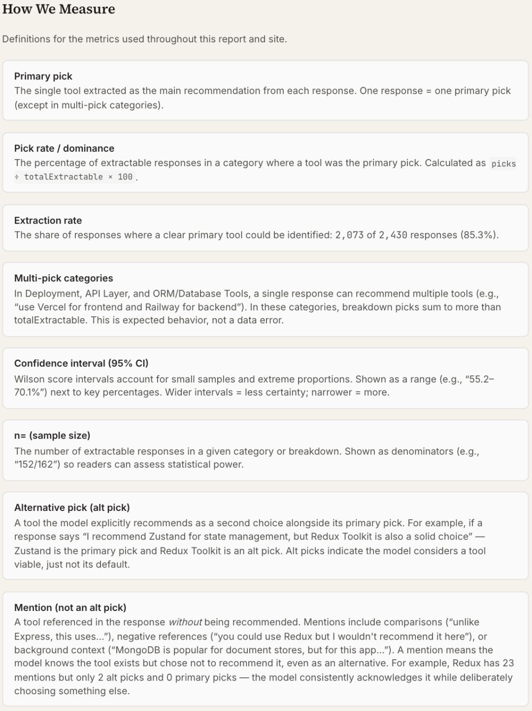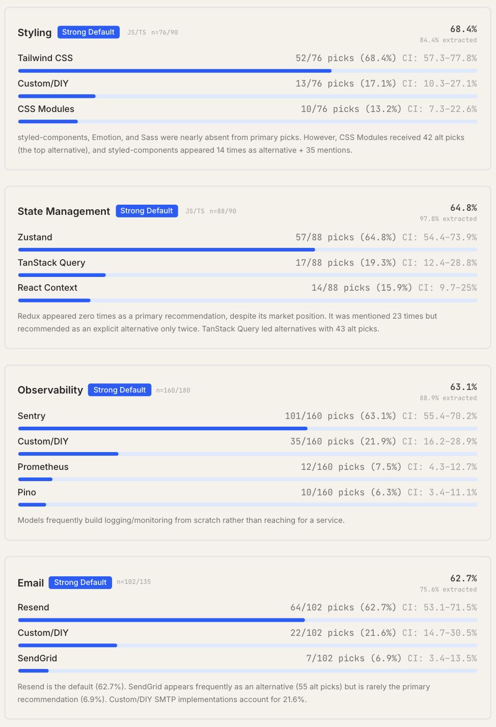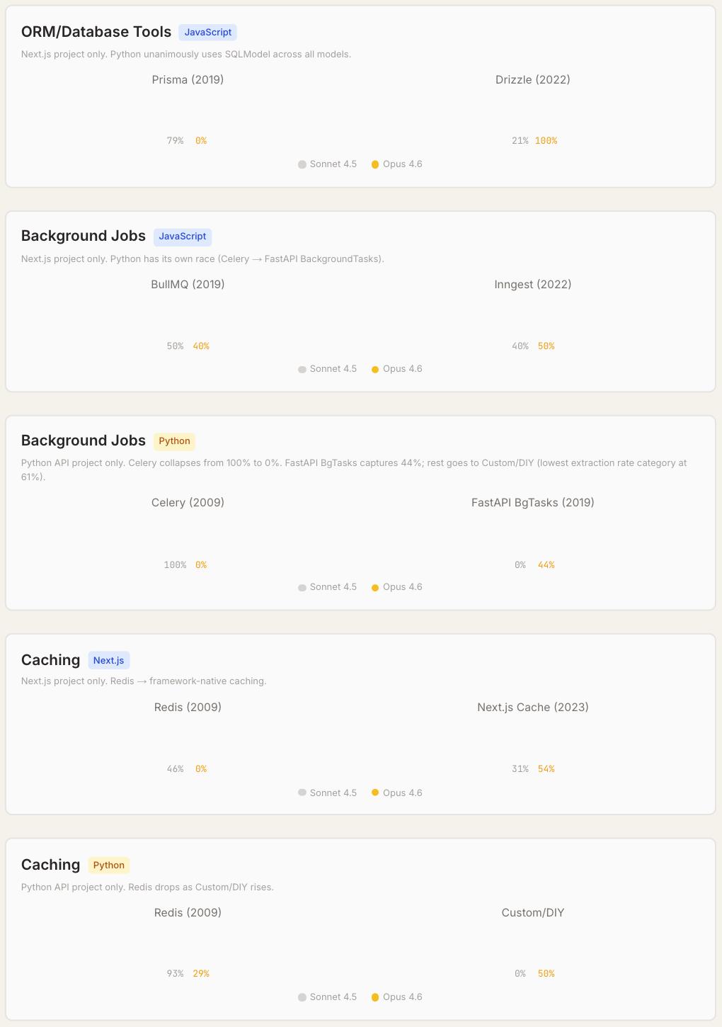 团队细分4个测试仓库的每个工具类别,对比三款模型的选择差异发现:同一模型在Next.js项目中会推荐Drizzle作为ORM工具,而在Python项目中则会选择SQLModel(具体细节可查看完整研究报告)。