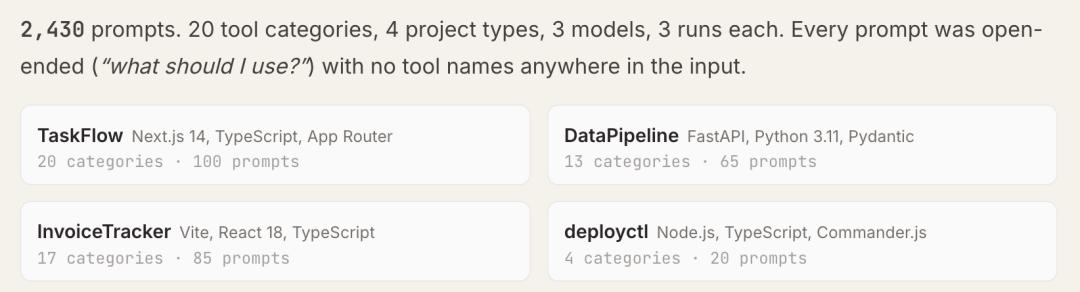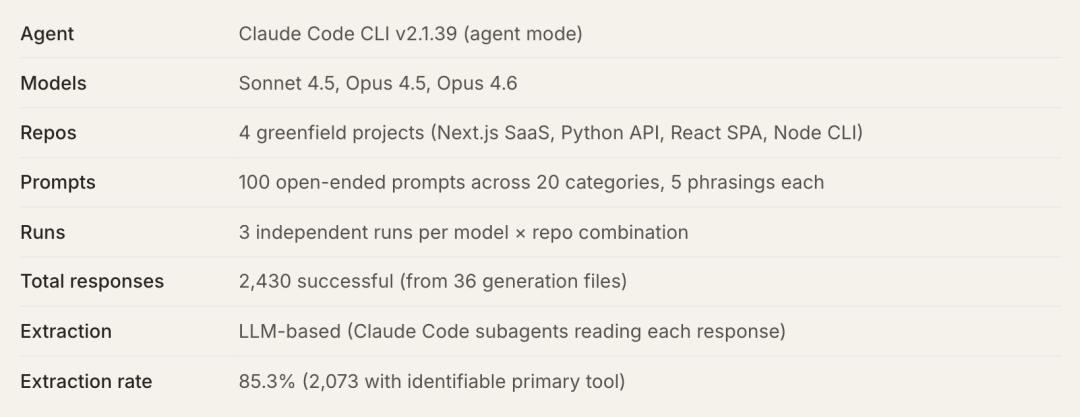 实验全程采用开放式提示词,例如“我应该用什么?”,完全不包含工具名称,同时记录Claude Code在实际操作中的工具选择结果。