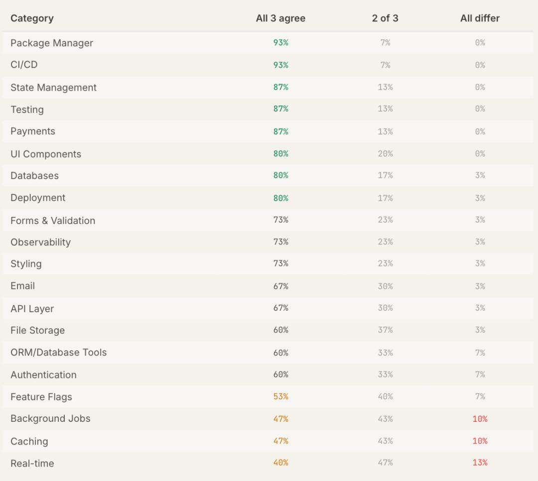 在同一生态(比如都是JS或都是Python)内比较时,三个模型在20个类别中的18个,都选择了相同的首选工具。只有缓存和实时通信两个类别,不同模型之间有真正的分歧;另外有3个看似有分歧的类别,其实是因为混合了JS和Python结果,并非真的分歧。