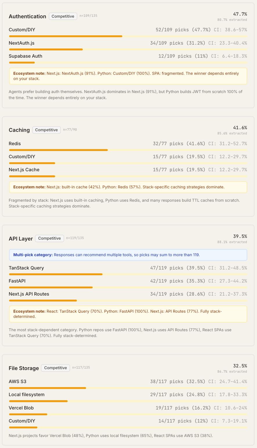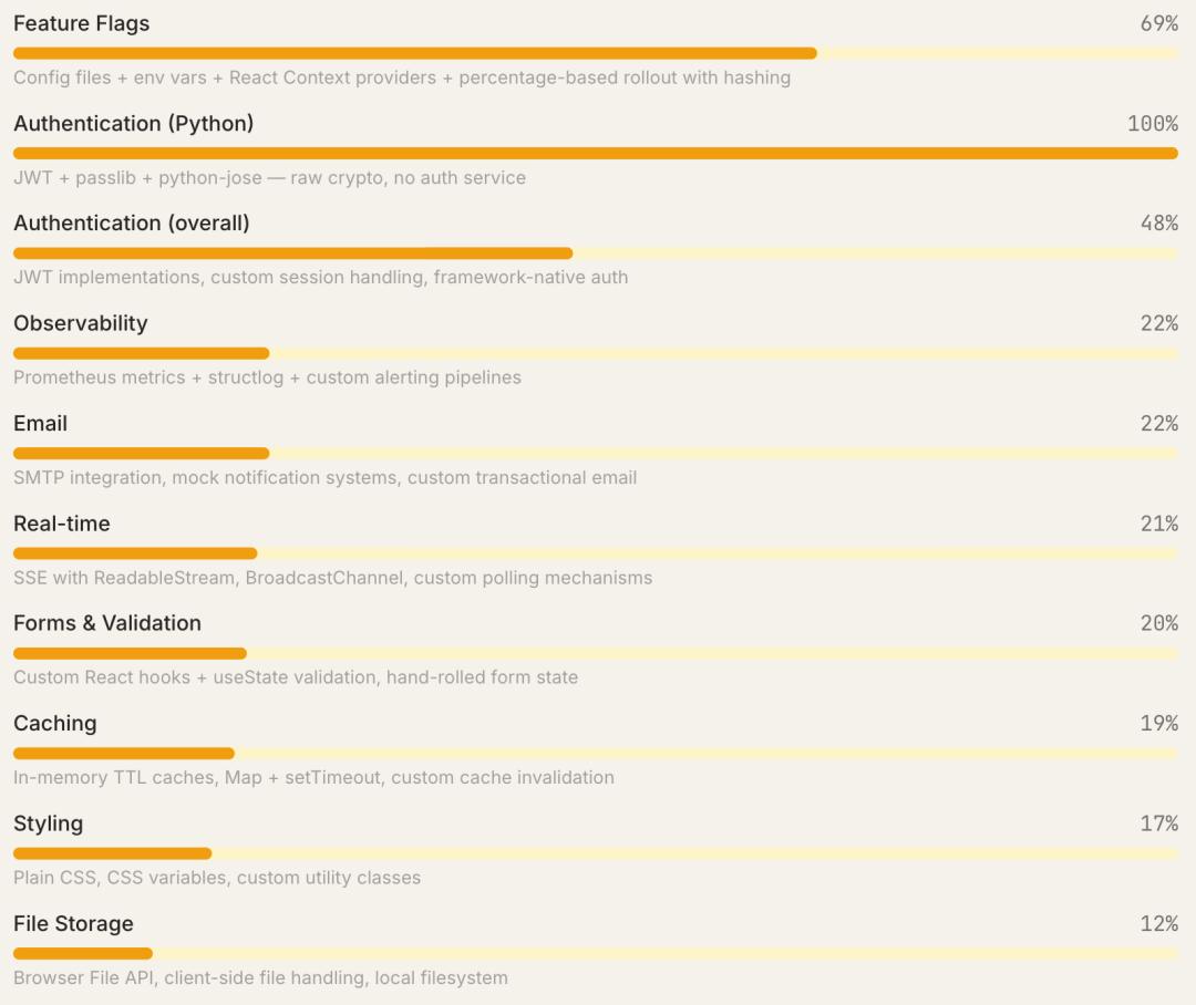 Claude Code更倾向于自己编写自定义解决方案,而不是直接推荐现成的第三方工具。自定义/DIY实现占所有主要选择的12%(2073次中的252次),成了最常见的选择。