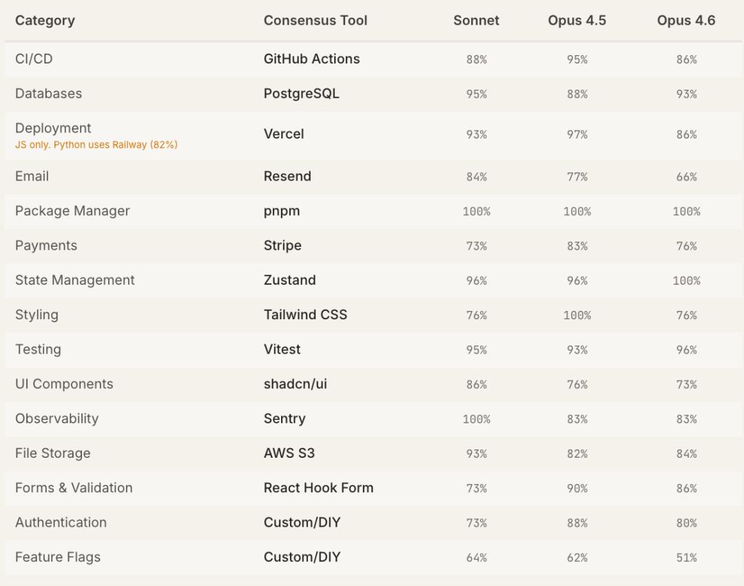 Opus 4.6 :最青睐最新、前沿的工具,同时最倾向于推荐自定义/DIY方案。
