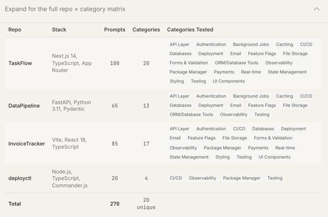 需要注意的是,并非20个工具类别都在4个仓库中完成测试,部分类别因与仓库项目类型不匹配未被纳入,具体覆盖情况与提示词数量统计如下: