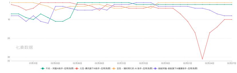 谁落后,谁陪跑?从App Store免费榜单的变动可以看到一些迹象。截至2月27日,字节豆包依旧稳居第一,阿里千问紧随其后位居第二,再往后是排在第八名的蚂蚁阿福和第十位的腾讯元宝。