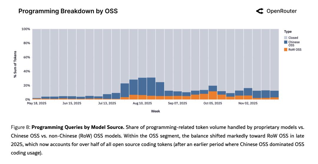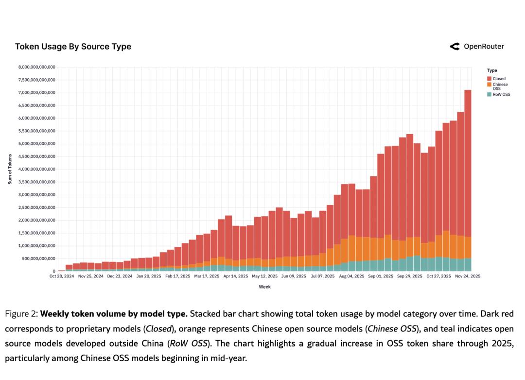 图:从2024年11月到2025年11月的周度Token总量堆叠柱状图。深红色=闭源模型,橙色=中国开源模型,蓝绿色=其他地区开源模型。能清晰看到中国开源模型(橙色)从几乎不可见到逐渐占到近30%的过程。