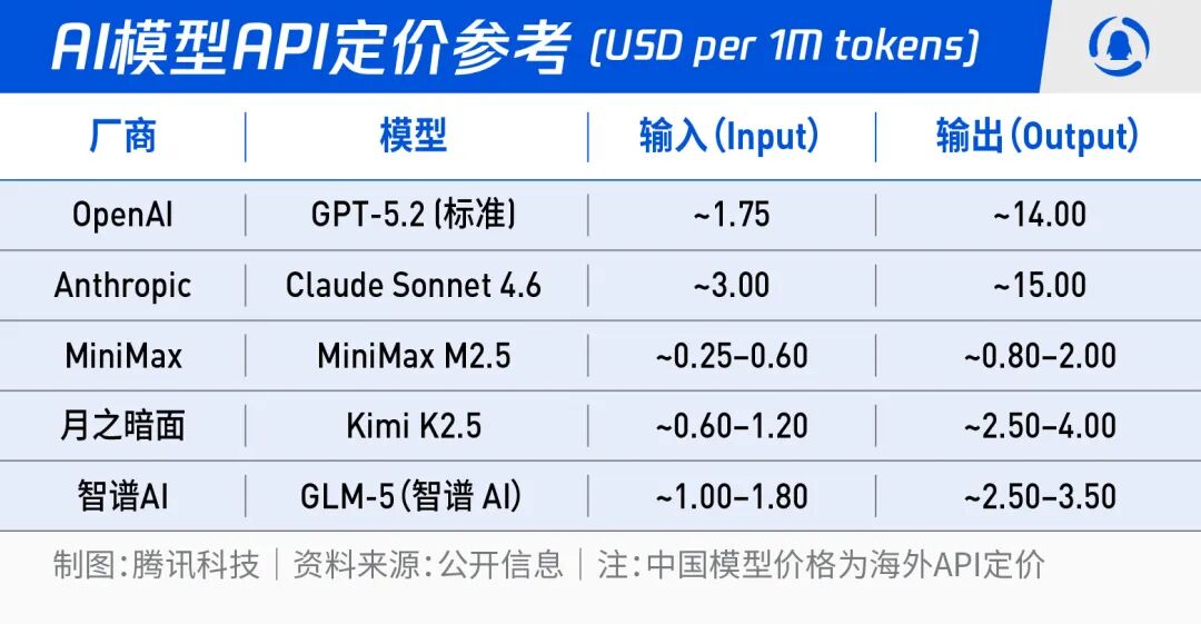 Claude 4.6 Sonnet 的输出价格为 15 美元 / 百万 Token,而 MiniMax M2.5 的典型输出价格约为 1.1 美元 / 百万 Token,前者是后者的约 13.6 倍。GPT-5.2 的输出价格为 14 美元 / 百万 Token,也接近 MiniMax 的 12.7 倍。即便是已经涨价的智谱 GLM-5,输出价格约为 2.55 美元 / 百万 Token,仍然只有 Claude 的大约六分之一左右。