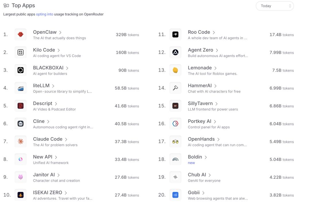 图:OpenClaw是OpenRouter最大的单一应用,其Token消耗量约占平台显著比例