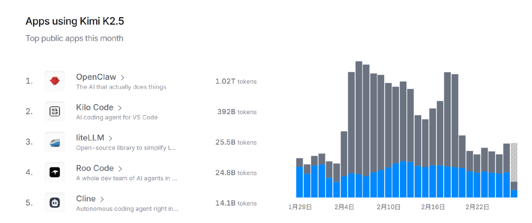 据OpenRouter数据显示,Kimi K2.5的调用场景前二分别来自于2月爆火的Agent产品“小龙虾”OpenClaw,和AI编程软件Kilo Code。这两款产品,也是OpenRouter上Tokens消耗排名前二的产品。