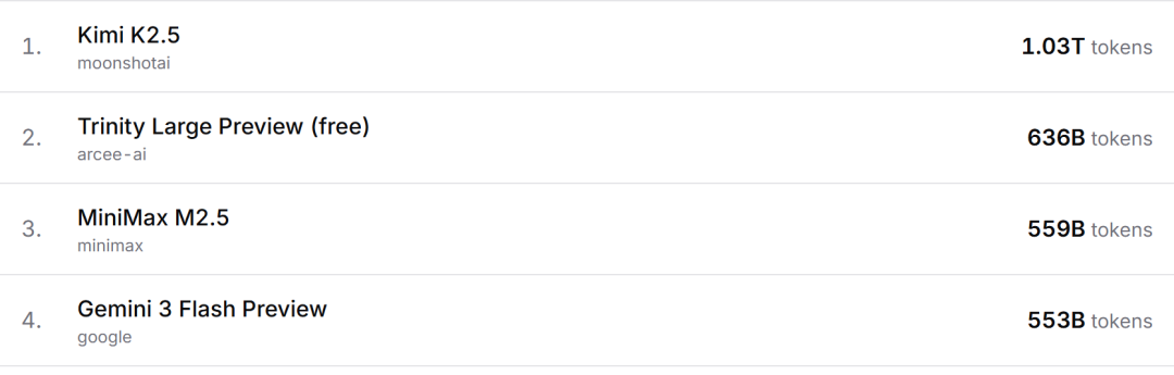 先从API说起,今年2月,Kimi K2.5模型成为海外市场调用量增长极为明显的一家。OpenRouter数据显示,该模型位于Tokens消耗第二的排名,环比增长23357%。