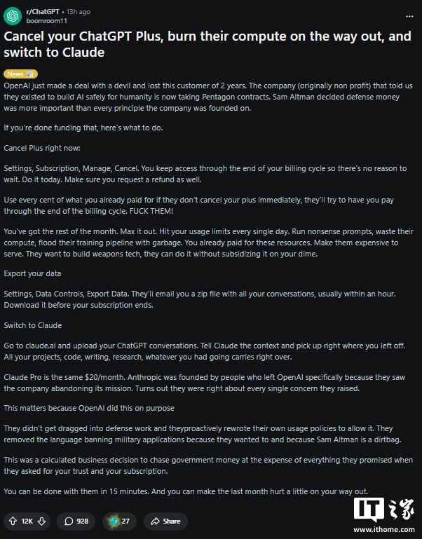 因此,用户选择了唯一能真正打击 OpenAI 的方式:用脚投票,停止付费。据 Tom's Guide 报道,“取消 ChatGPT(Cancel ChatGPT)”的运动正在蔓延,似乎已经影响到这家人工智能巨头的收入。当然,取消订阅的实际规模难以估量,可能只是在 Reddit 和 X 上发声的少数人,而绝大多数 ChatGPT 用户仍在正常使用,全然不知自己的数据可能会被战争部使用。