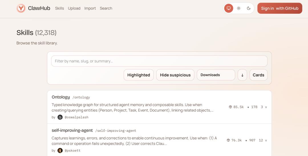 ClawHub 上用户自发上传的 skills 数量已经破万,五花八门|图片来源:ClawHub 官网v