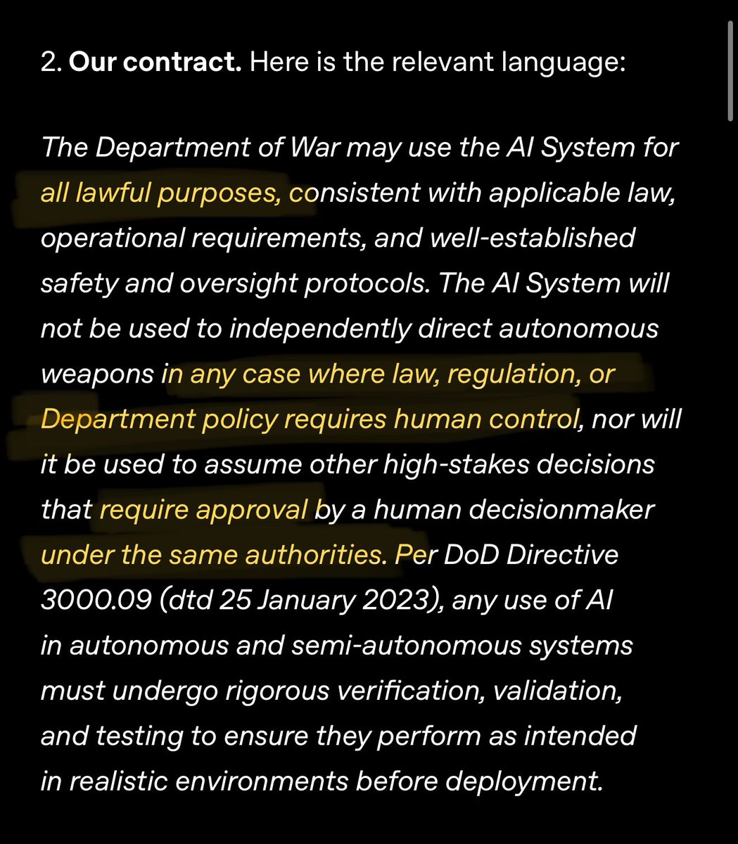 因为OpenAI确实保留了「所有合法使用」这一条款,并将AI的使用置于适用法律之下。 而Anthropic恰恰拒绝了这一点。