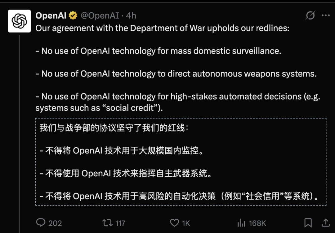 就在Anthropic被「封杀」的同时,劲敌OpenAI迅速补位,官宣与五角大楼达成协议。