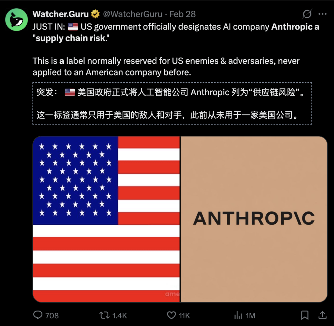 五角大楼要求无限制访问导致冲突,特朗普下令联邦禁用Anthropic技术,并列为「供应链风险」。