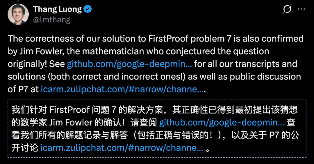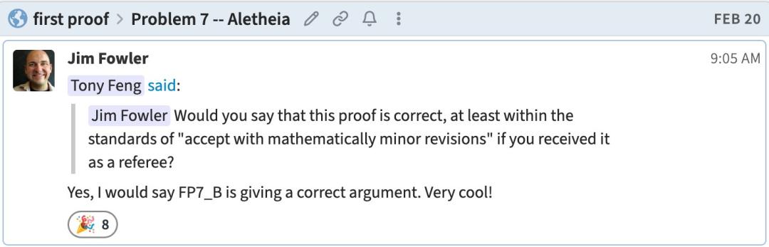 结果,Aletheia不仅自主算出了答案,甚至连提出其中第7题猜想的数学家Jim Fowler本人,都亲自出面盖章确认: