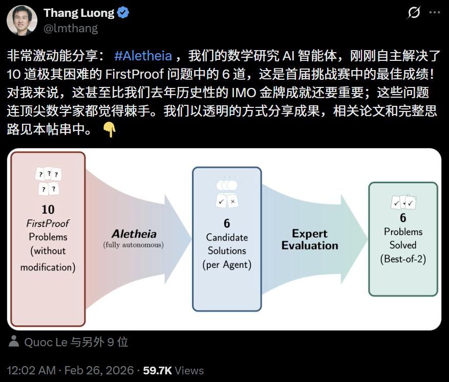 「超级激动!我们的数学科研AI智能体 #Aletheia,刚刚全自主解出了10道出了名变态难的FirstProof挑战题里的6道,直接拿下了首届全场最佳!」