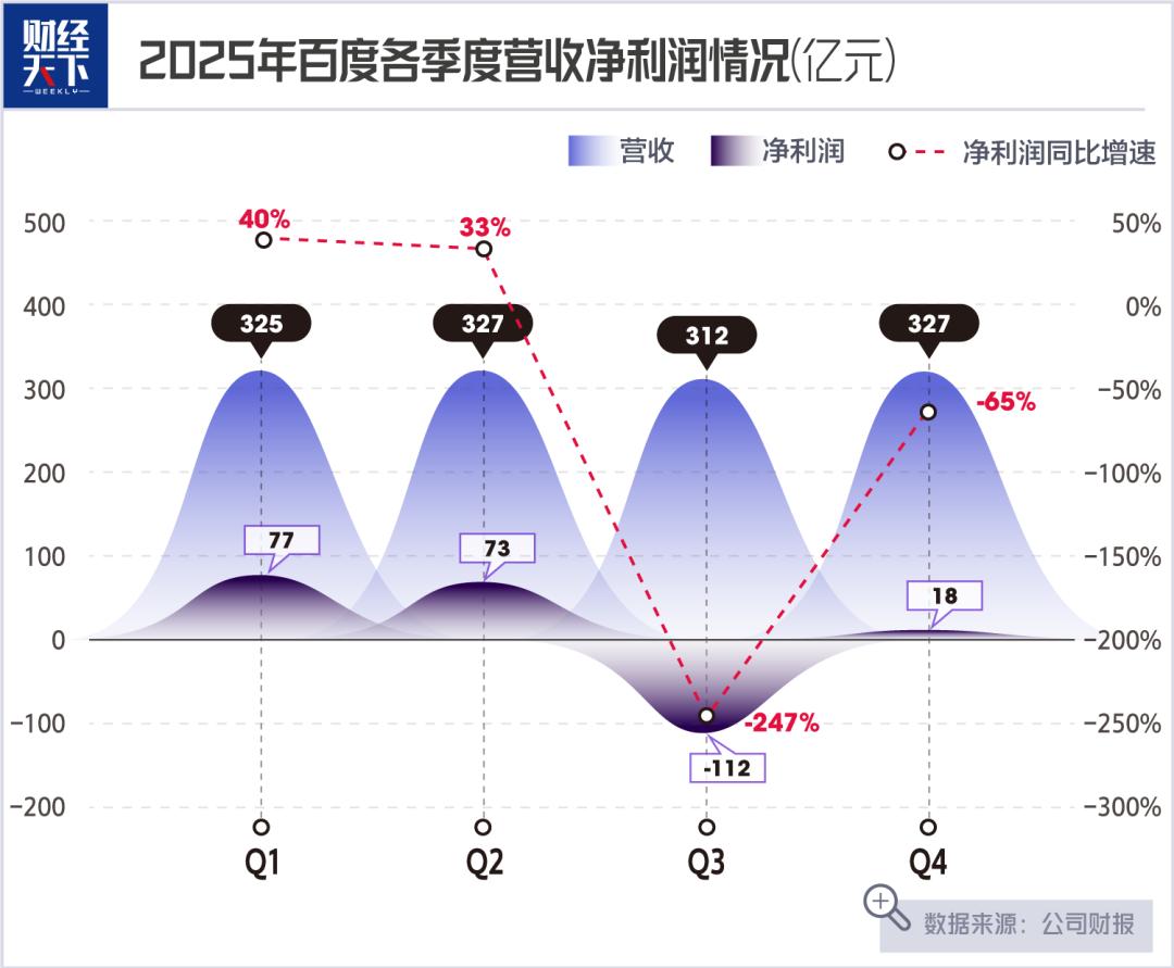 2月26日,“All in AI”的百度交出了2025年的成绩单。财报显示,百度去年全年总营收为1291亿元,同比下降3%;归母净利润为56亿元,同比下降76%,较上年同期缩水约182亿元。