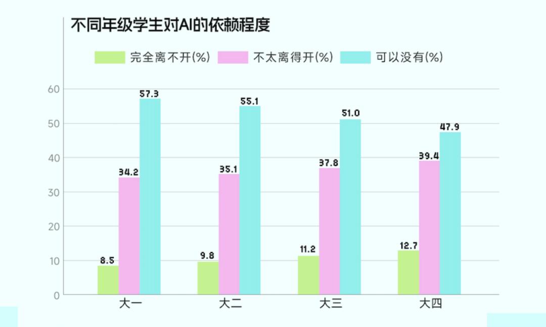 一项针对商学院学生的研究发现,频繁使用 AI 工具与批判性思维能力之间存在显著的负相关:年龄越小的学生,对 AI 的依赖越强,批判性思维得分越低。一位受访者的自白很有代表性,「我太依赖 AI 了,离开它我可能都不知道怎么解决问题。」