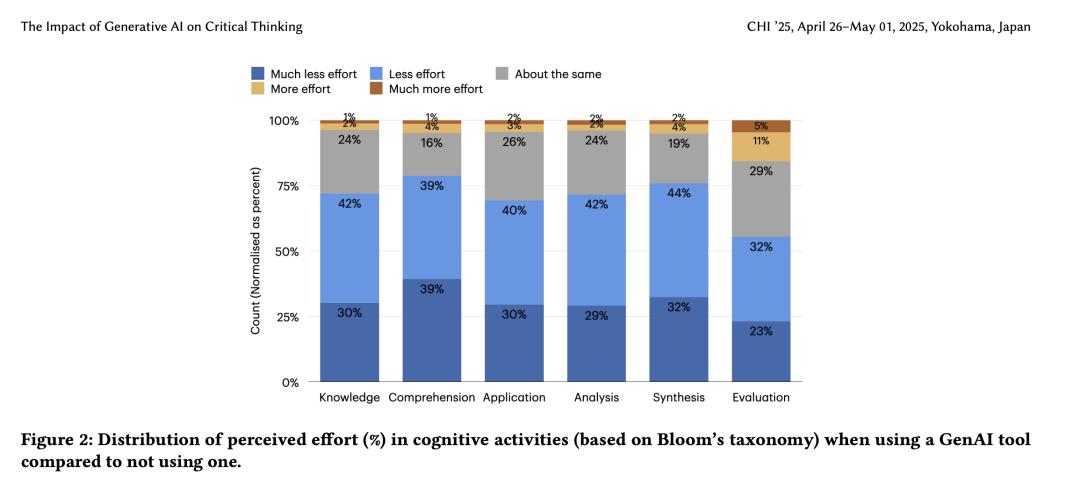 微软自己出钱做的一项研究(The Impact of Generative AI on Critical Thinking)则发现了一个更微妙的机制:知识工作者对 AI 工具越有信心,自己投入的批判性思考就越少。