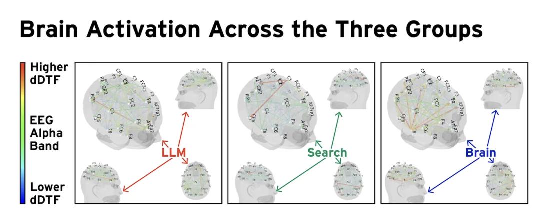 一项发表在 arXiv 上的研究(Your Brain on ChatGPT: Accumulation of Cognitive Debt)做过一个直接的实验:让学生分别用搜索引擎、大语言模型(LLM)和什么都不用三种方式写文章,同时监测脑活动。