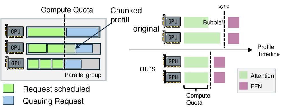 为了防止拿到短任务的GPU“干等着”拿到长任务的GPU,它需要使用基于计算配额的批处理选择算法,把长任务分割为短任务,这样多张GPU计算注意力机制的时间就能基本对齐,尽快进入到下一个环节。