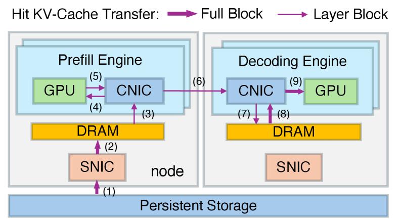 先前的架构采用的路径是:让预填充引擎直接通过自己的存储网卡,从硬盘或分布式存储中拉取KV-Cache数据。