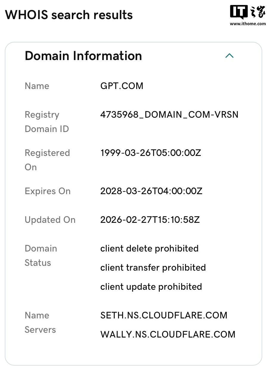 IT之家 3 月 2 日消息,据 Domain Investing 昨天报道,OpenAI 似乎已经收购 GPT.com 域名。目前访问该网站会被重定向至 ChatGPT.com。