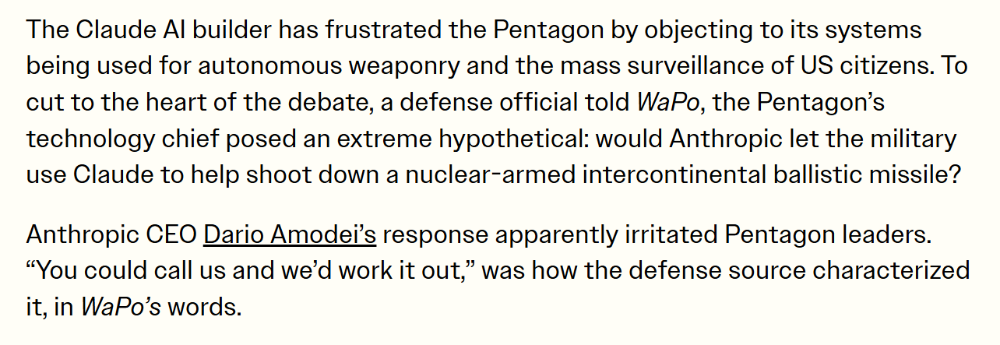 在媒体披露的另一段对话中,一位五角大楼官员先是提出了一个极端假设:若军方需借助Claude系统拦截携带核弹头的洲际弹道导弹,Anthropic是否会授权?而达里奥的回答是:你们可以打电话给我们,我们跟你一起想办法。