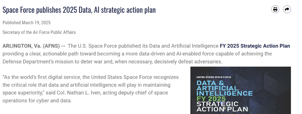 在AI战略上,美国太空军在2024和2025连续两年发布“数据人工智能战略行动计划”,将AI纳入其全军数据战略框架,强调AI与数据技术必须融入太空作战与空间监视体系,用于“处理海量传感器数据并快速输出高价值信息”。