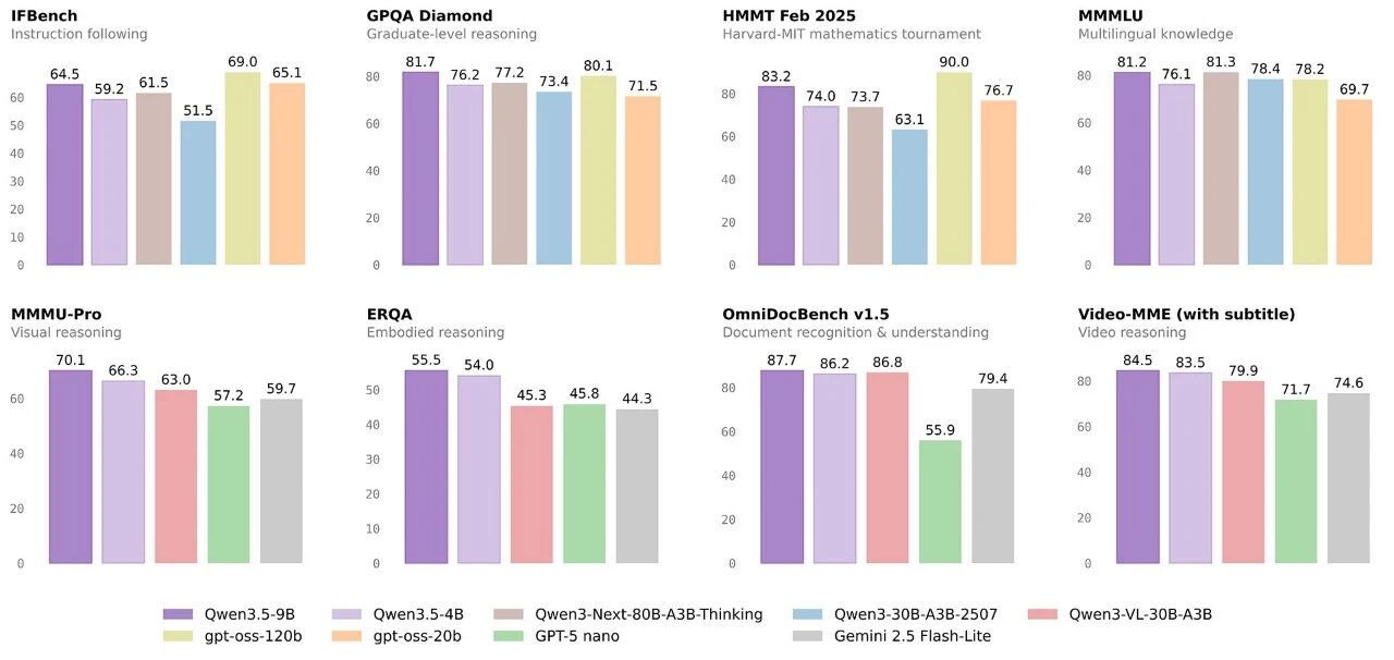 IT之家 3 月 2 日消息,今天阿里千问宣布开源 4 款 Qwen3.5 小尺寸模型系列:Qwen3.5-0.8B/2B/4B/9B。官方称,这一系列模型继承了 Qwen3.5 家族的强大基因,采用原生多模态训练、最新的模型架构,表现出卓越的性能,以满足从极端资源受限到高性能轻量级应用的不同需求。