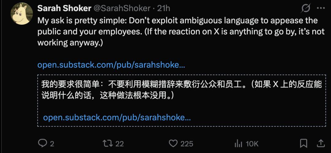 这次她要追问的很简单:OpenAI请不要含糊其辞,从而敷衍大家和员工。