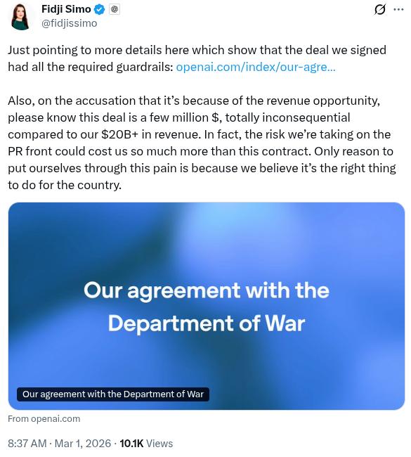 (OpenAI与美国国防部的交易金额)也就几百万美元,与我们200多亿美元的年收入相比微不足道,绝对不值得为此引发公关风波。