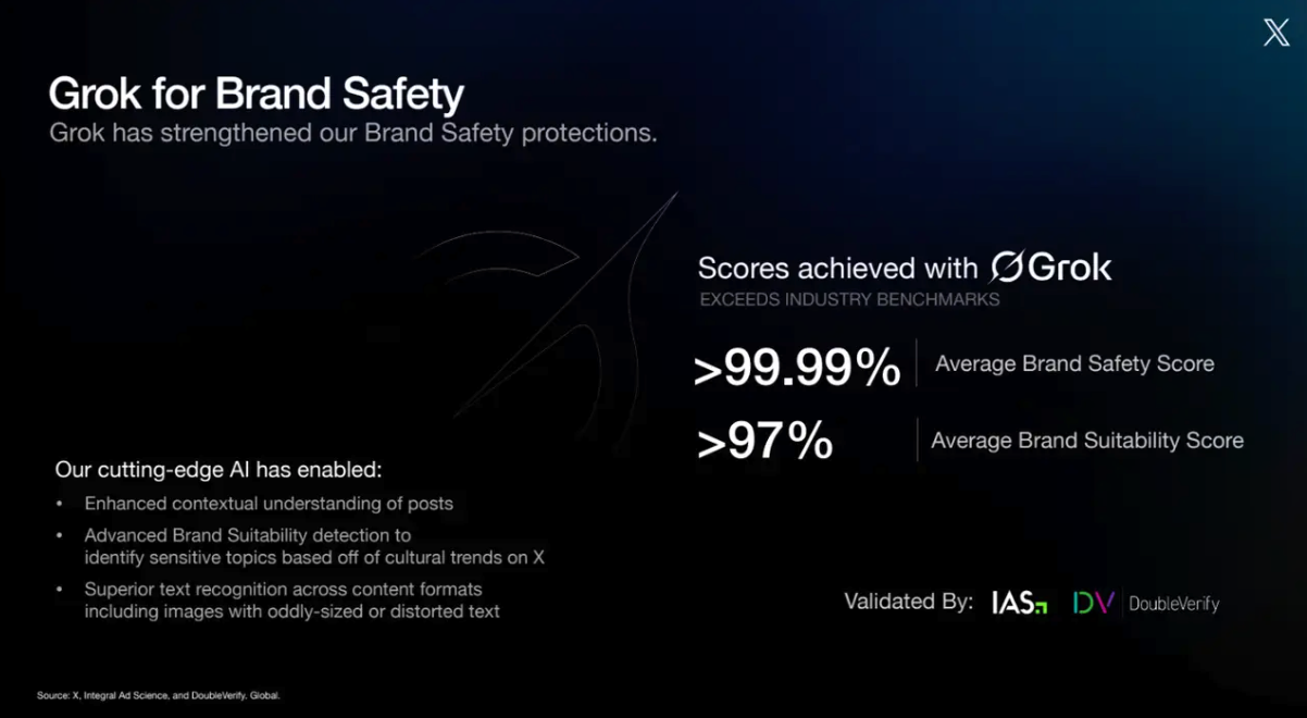 X在幻灯片中表示,根据科技公司IAS和DoubleVerify的评测,使用Grok后,其“品牌安全”或内容适宜性评分已达到近乎100%的完美水平。