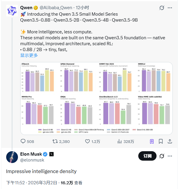 凤凰网科技讯 3月3日,近期,阿里开源三款中等规模的新模型,包括Qwen3.5-35B-A3B、Qwen3.5-122B-A10B、Qwen3.5-27B。基于架构创新和训练突破,此次开源的三款千问3.5模型均创下中等尺寸模型的性能新高,这引发了市场关注,马斯克对阿里巴巴的Qwen模型发表评论,表示“Impressive intelligence density(智能密度令人印象深刻)”。
