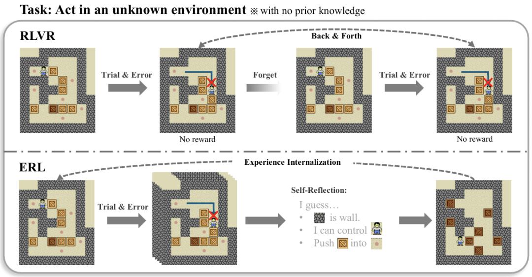 图2:传统强化学习主要依赖反复试错进行探索,而ERL通过反思机制对失败进行分析并修正策略,使行为改进能够持续积累。