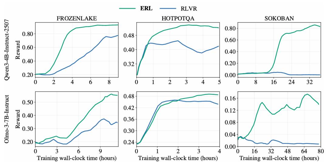 这一设计更接近真实未知环境,旨在评估模型在缺乏先验知识情况下通过经验进行学习和自我改进的能力。结果显示,ERL在所有任务上都优于传统RLVR方法(图4)。