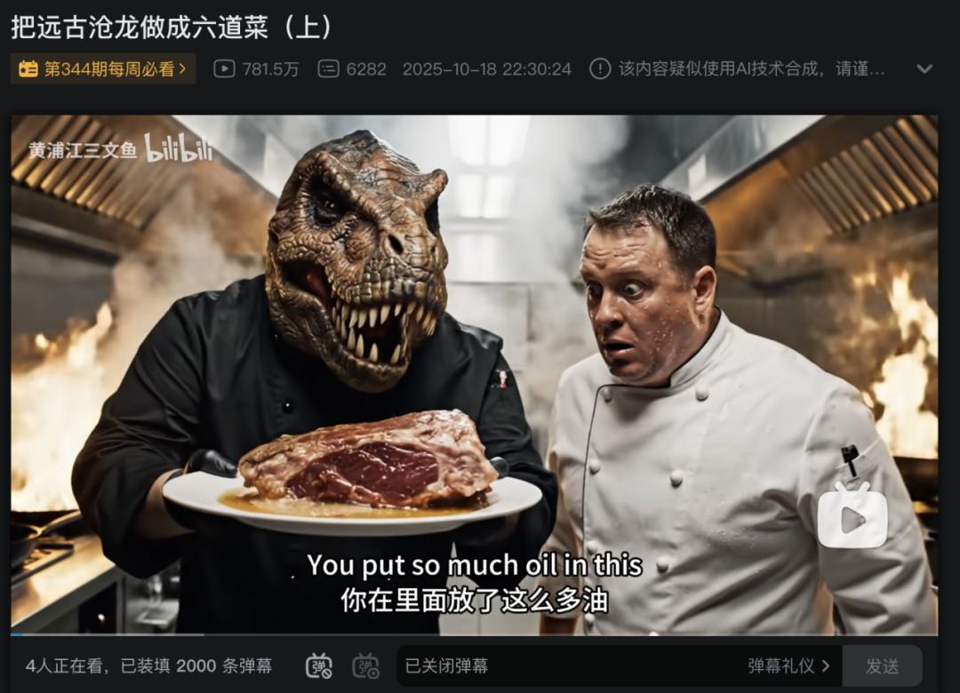 sd2.0发布时,@黄浦江三文鱼 甚至是「无奈」「感受到压力」的。前两年,在AI的视频生成能力还不够成熟的阶段,凭借上万字的提示词和专业的分镜能力,他账号内《把远古沧龙做成菜》系列视频成为首批出圈、最先进的AI内容。
