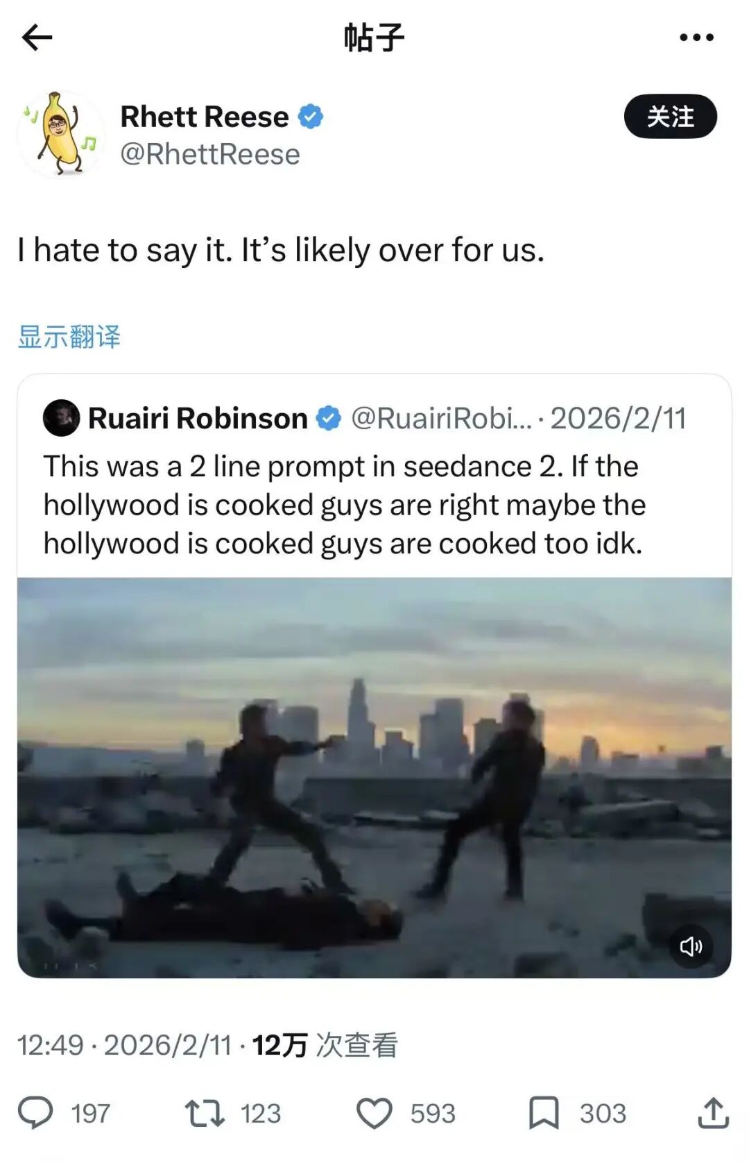 2月11日,《死侍》系列编剧瑞特·里斯(Rhett Reese)通过X转发一段由sd2.0生成的「汤姆·克鲁斯大战布拉德·皮特」的AI视频,并评论道:「I hate to say it. It's likely over for us.」