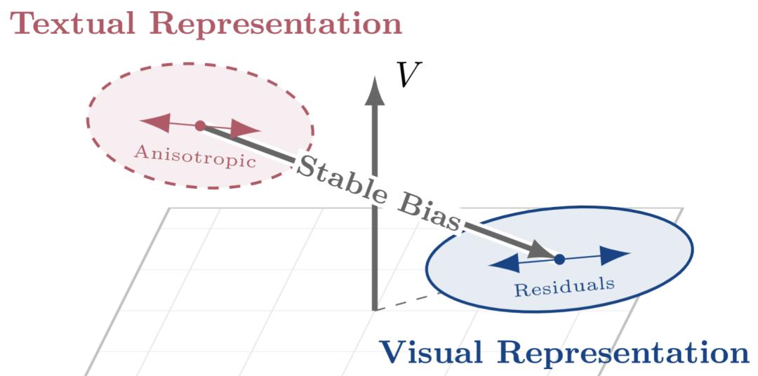 以往的方法虽然承认图像和文本在对比学习预训练的共享表征空间中存在距离,但它们简单地认为这种偏差是均匀的。它们假设鸿沟中的噪音像一个完美的球体(各向同性),向四面八方均匀扩散。