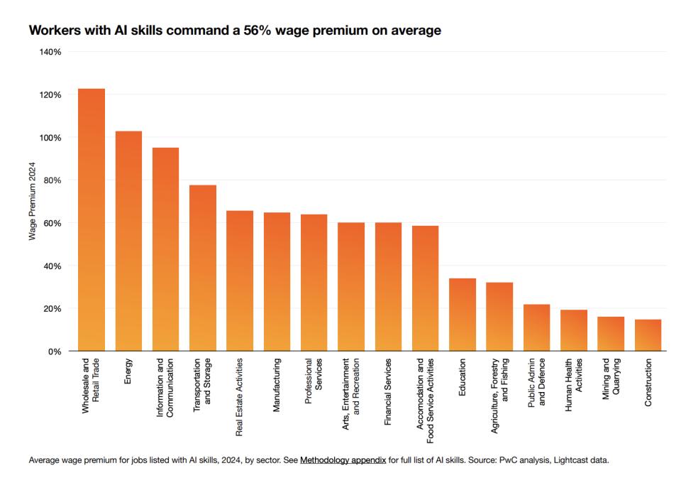 市场对这极小部分掌握新生产力工具的人给予了极其丰厚的回报。PwC和Lightcast的数据高度一致:在同一职业中,包含AI技能要求的岗位平均能获得15%到30%的薪资溢价,甚至在某些核心知识领域(如律师、金融分析师)工资差异能拉大到56%。