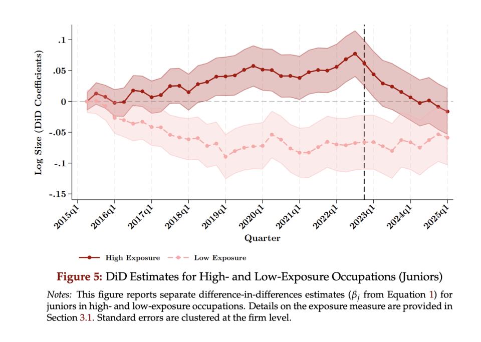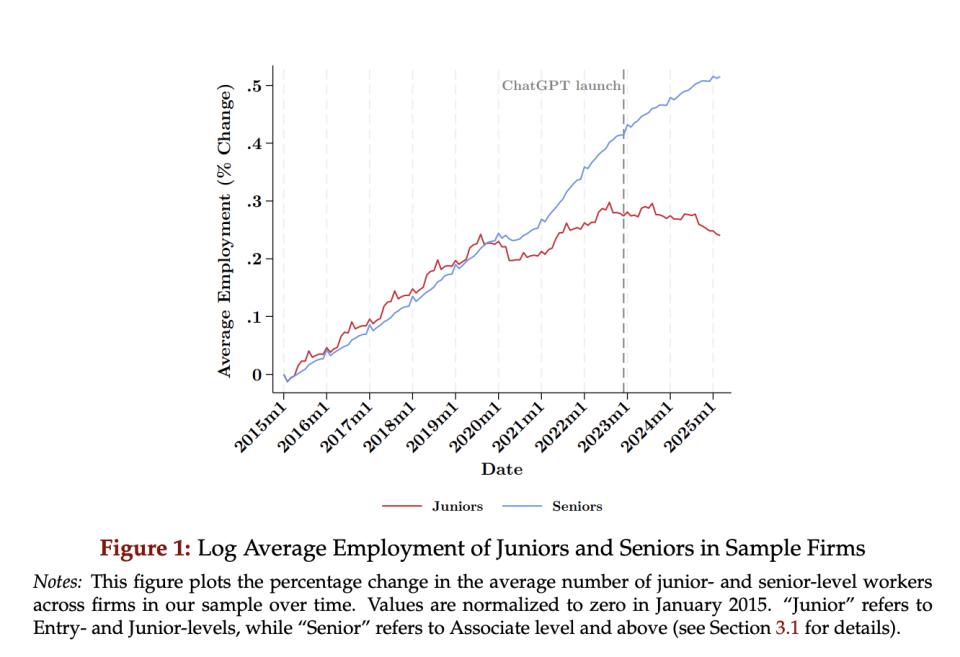 一项覆盖6200万劳动者的研究发现,从2023年一季度起,采用GenAI的企业初级岗位就业明显下滑。企业不是在裁人,而是干脆不招了。