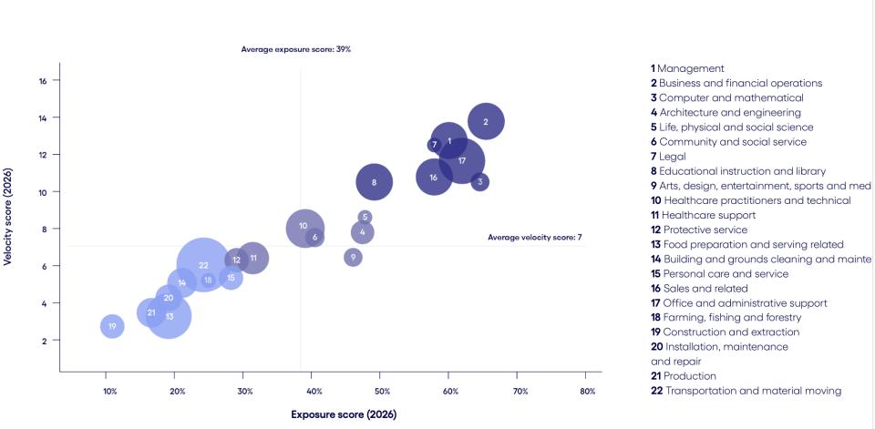 Cognizant用了一个指标叫「速率得分」(Velocity Score),说白了就是你的职业被AI吃掉的速度有多快。