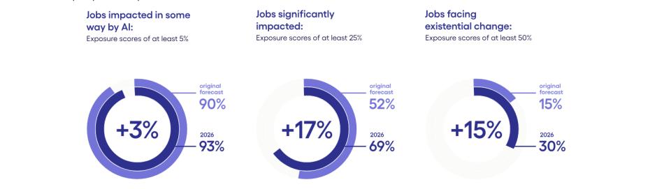 具体到岗位上,任务暴露度超过50%的岗位比例从2023年的0%飙升至30%(原预测2032年仅为15%),而所有任务至少暴露25%的岗位则增长了17%,达到69%。