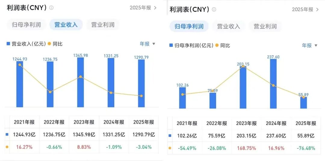 但从全年来看,总营收1291亿元,同比略有3%的下滑。