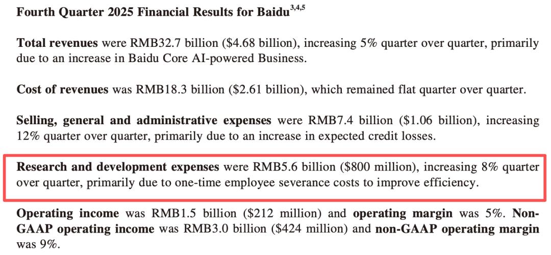 财报显示,四季度百度研发费用达56亿元,环比增长8%,而这一增长的核心原因,并非传统研发投入的增加,而是公司支付的一次性员工遣散费用。