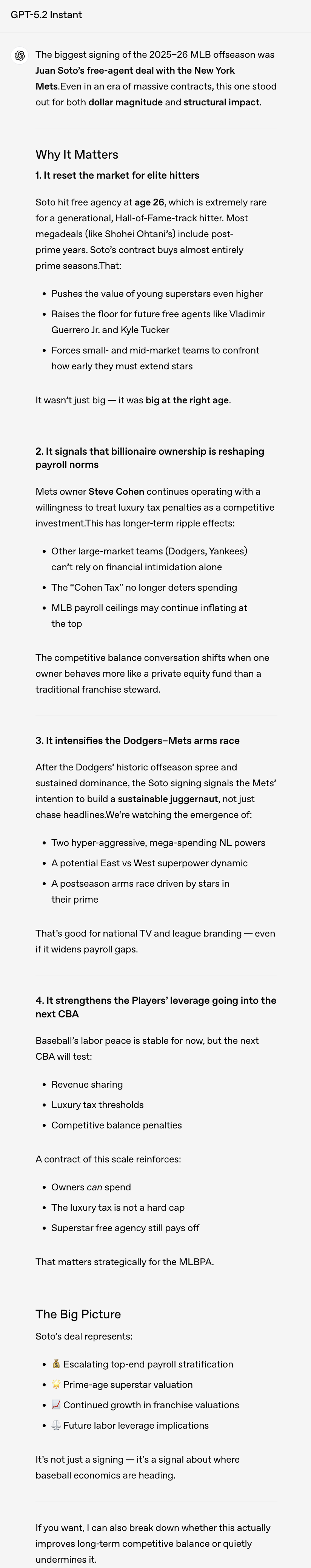 GPT-5.2 Instant 回答的是上一年胡安 · 索托签约大都会的旧闻,分析框架没问题,但信息过时了。