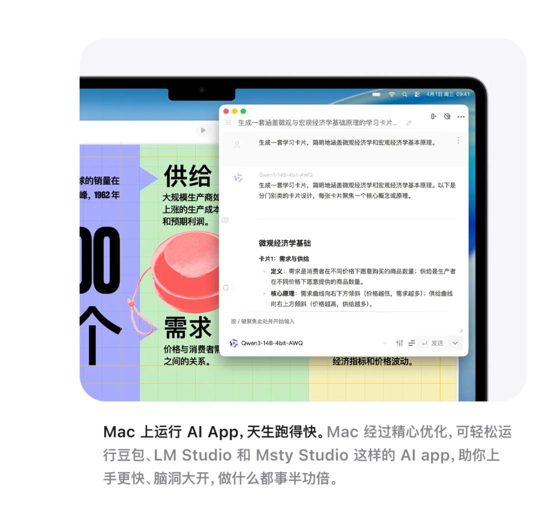 2023 年底,苹果开源了 MLX,把专门针对 M 系列芯片优化的模型推理框架直接给了开发者。去年,基础模型框架随 Apple 智能发布,App 开发者可以在 iPhone 和 Mac 上调用系统内置的基础模型,无需联网,数据不离开设备。